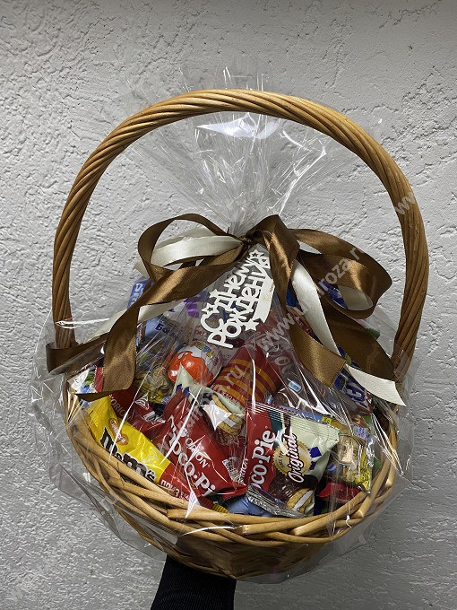 Шоколадки 7, чупа-чупсы 5, киндеры 5, кока кола (аналог) 1, печенье 3, топпер 1, корзина, пленка, лента
