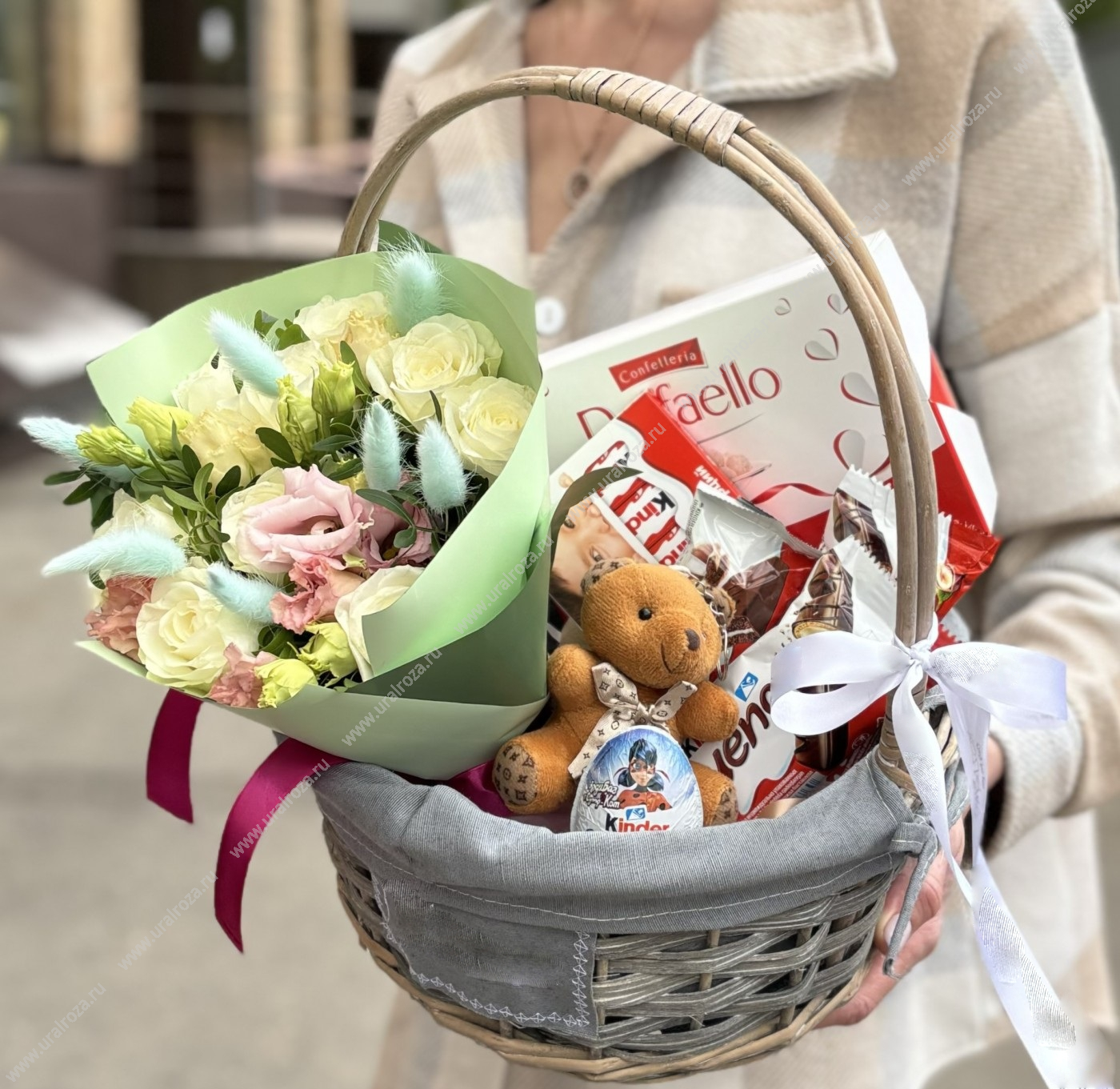Подарочный набор в корзине с конфетами и букетом. Идеальная для презента ребенку.