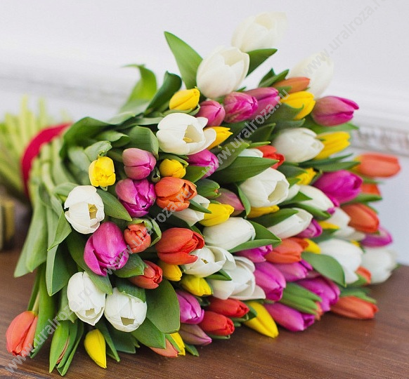Голландские и Уральские 2-х или разных расцветок в букете тюльпаны - отличный подарок к весеннему празднику празднику 1-8 марта и вообще круглый год, но под 8 марта цена падает из-за наволнения рынка местными тюльпанами. Следите за ценами.