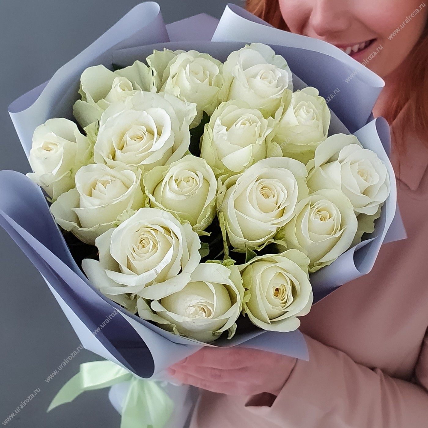 - Состав: Пленка матовая (1шт.); Лента атласная (1шт.); Белая роза Россия 50-60 см (15шт.);
