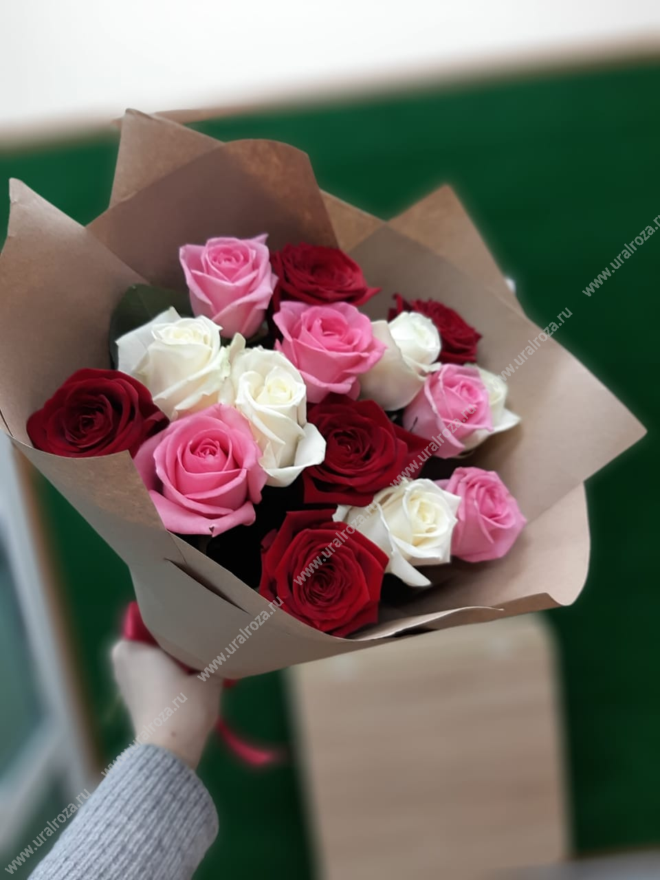 - Состав: Пленка матовая (1шт.); Лента атласная (1шт.); Миксовая роза Россия 50-60 см (15шт.);