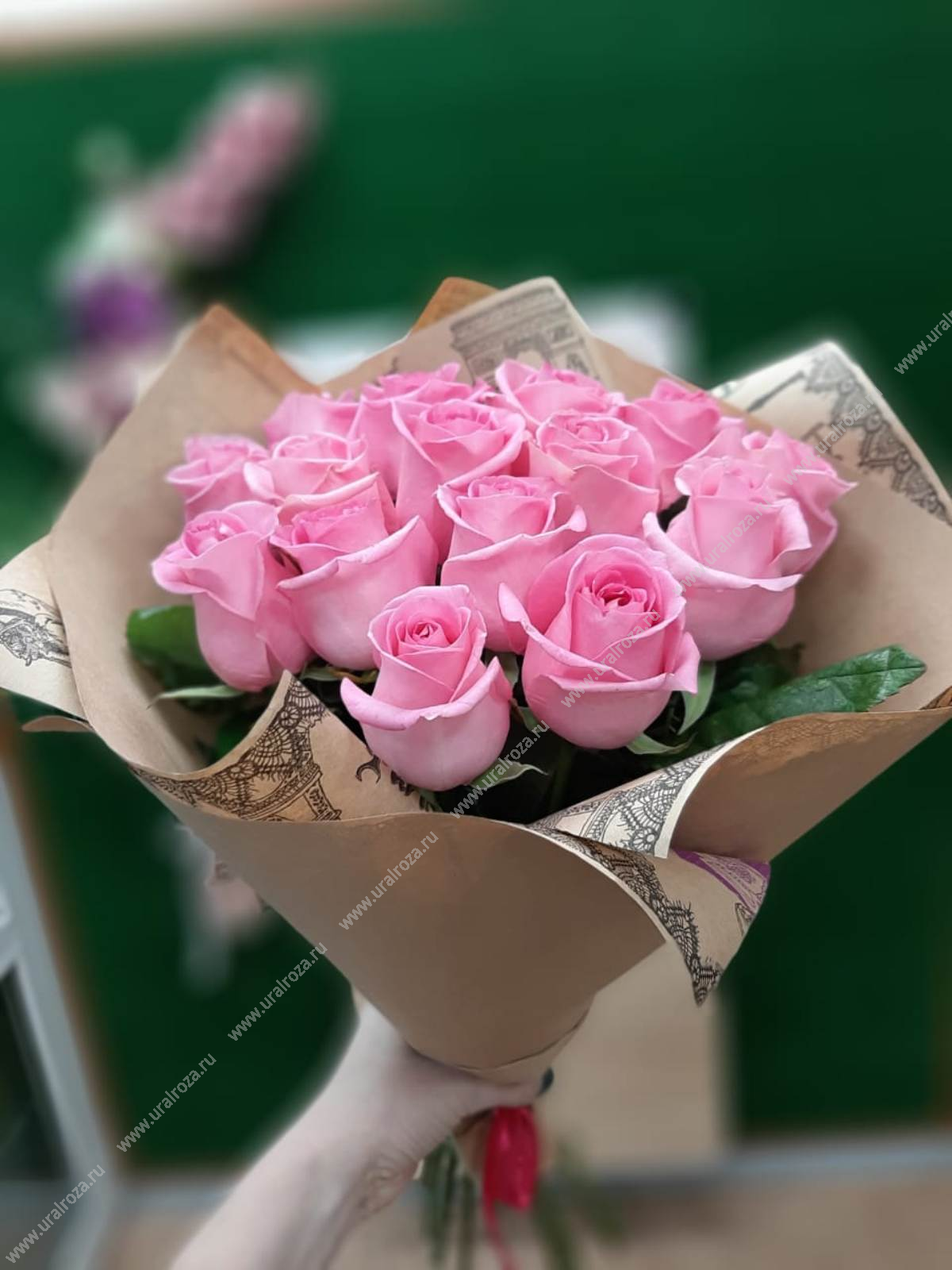 - Состав: Пленка матовая (1шт.); Розовая роза Россия 50-60 см (15шт.); Лента атласная (1шт.);