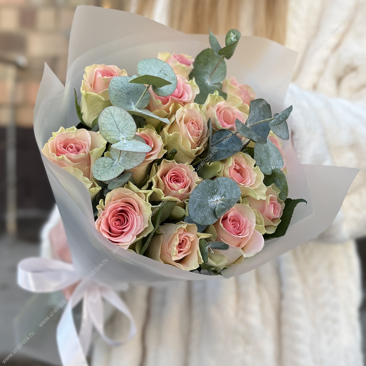- Состав: Розовая роза Россия 50-60 см (15шт.); Эвкалипт (3шт.); Лента атласная (1шт.); Пленка матовая (2шт.);