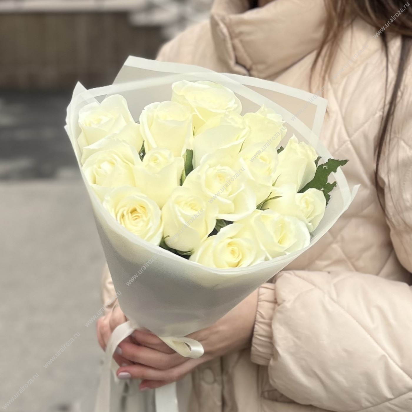 - Состав: Белая роза Кения 40 см (15шт.); Пленка матовая (1шт.); Лента атласная (1шт.);