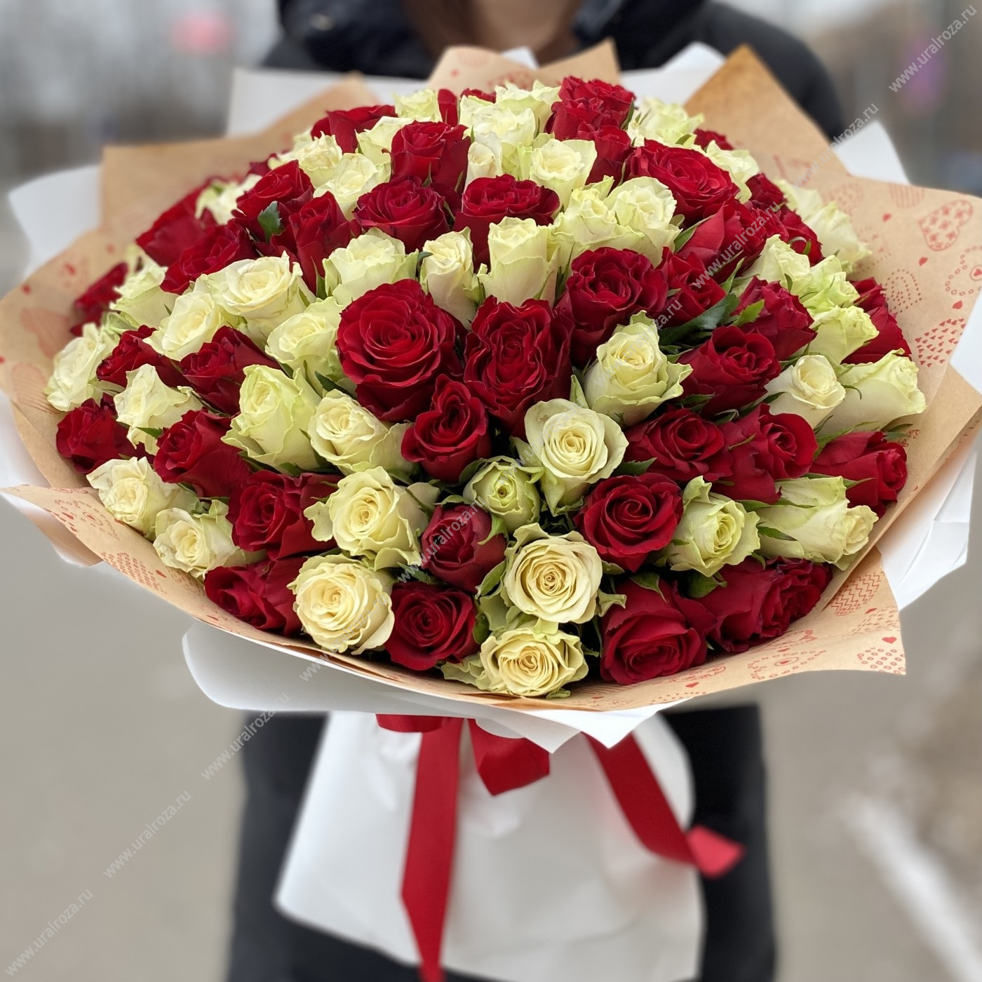 Этот роскошный букет состоит из 101 розы, которые являются символом любви и страсти. Каждая роза тщательно подобрана и создает яркое и изысканное сочетание цветов. Букет упакован в матовую пленку, которая придает ему изысканный вид, а также украшен атласной лентой, добавляющей нотку изысканности и элегантности. Этот букет станет прекрасным и незабываемым подарком для особенного человека в вашей жизни.