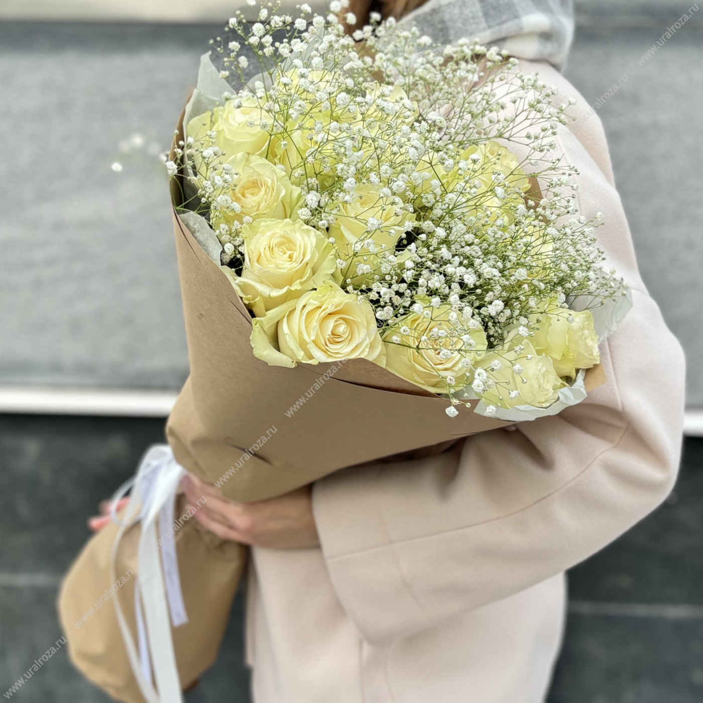 - Состав: Гипсофила (5шт.); Пленка матовая (2шт.); Лента атласная (1шт.); Белая роза Россия 50-60 см (15шт.);