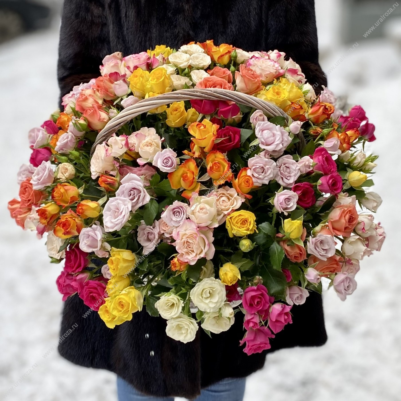 - Состав: Корзина до 90 роз (1шт.); Лента атласная (2шт.); Пиафлор кирпич (6шт.); Цветная кустовая роза МИКС (51шт.);