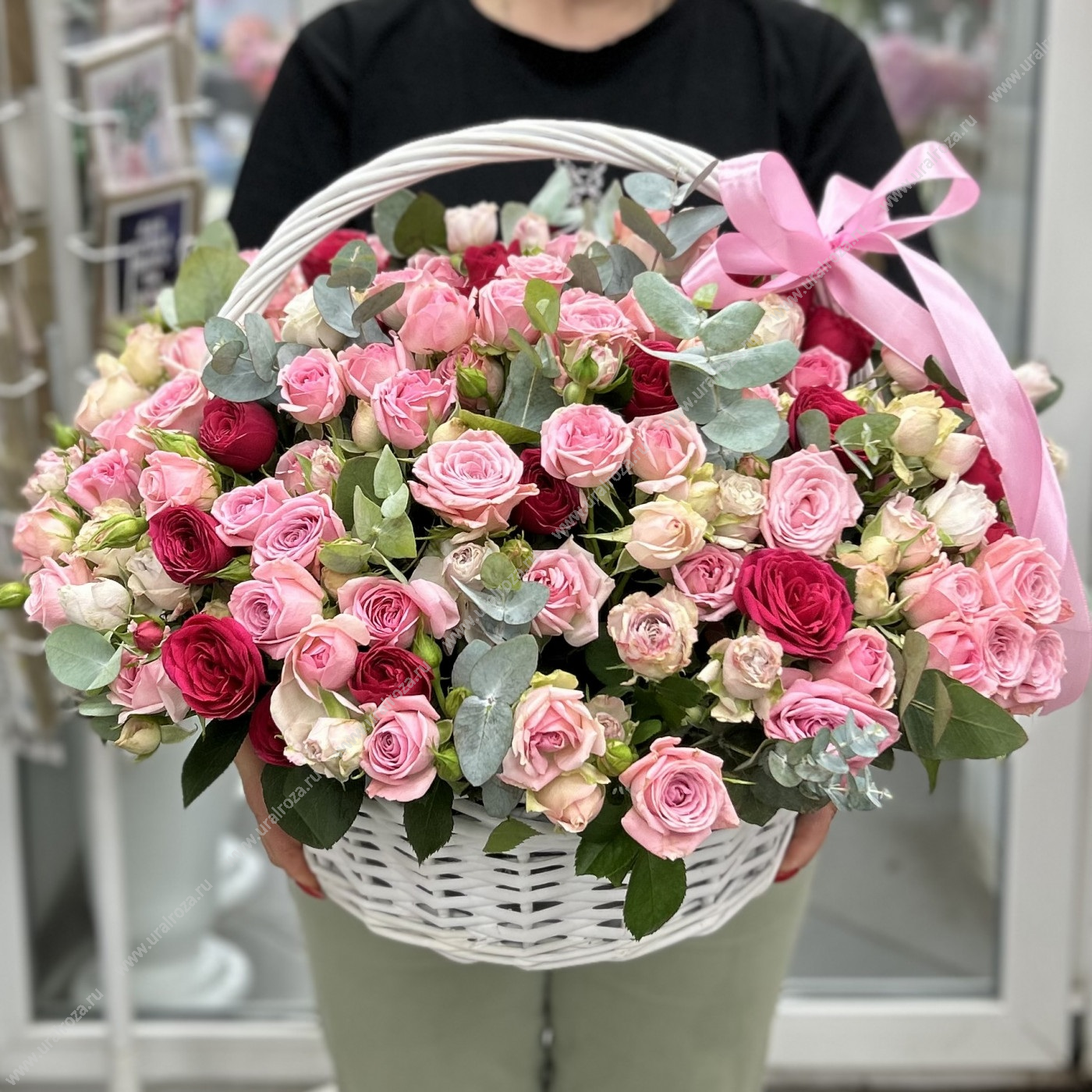 - Состав: Корзина до 90 роз (1шт.); Лента атласная (2шт.); Цветная кустовая роза МИКС (51шт.); Пиафлор кирпич (6шт.);