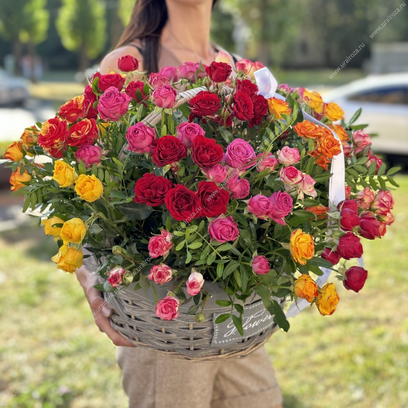 Микс из кустовых роз в корзине, в состав входят розы ярких сортов.