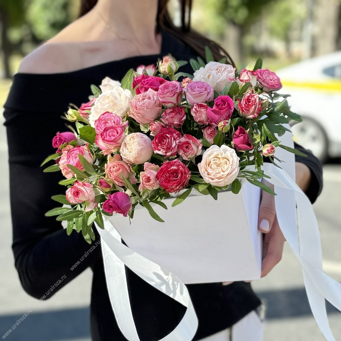 Микс цветов в коробке. Состав и сорт цветов могут отличаться от фото, цветовая гамма композиции будет сохранена.