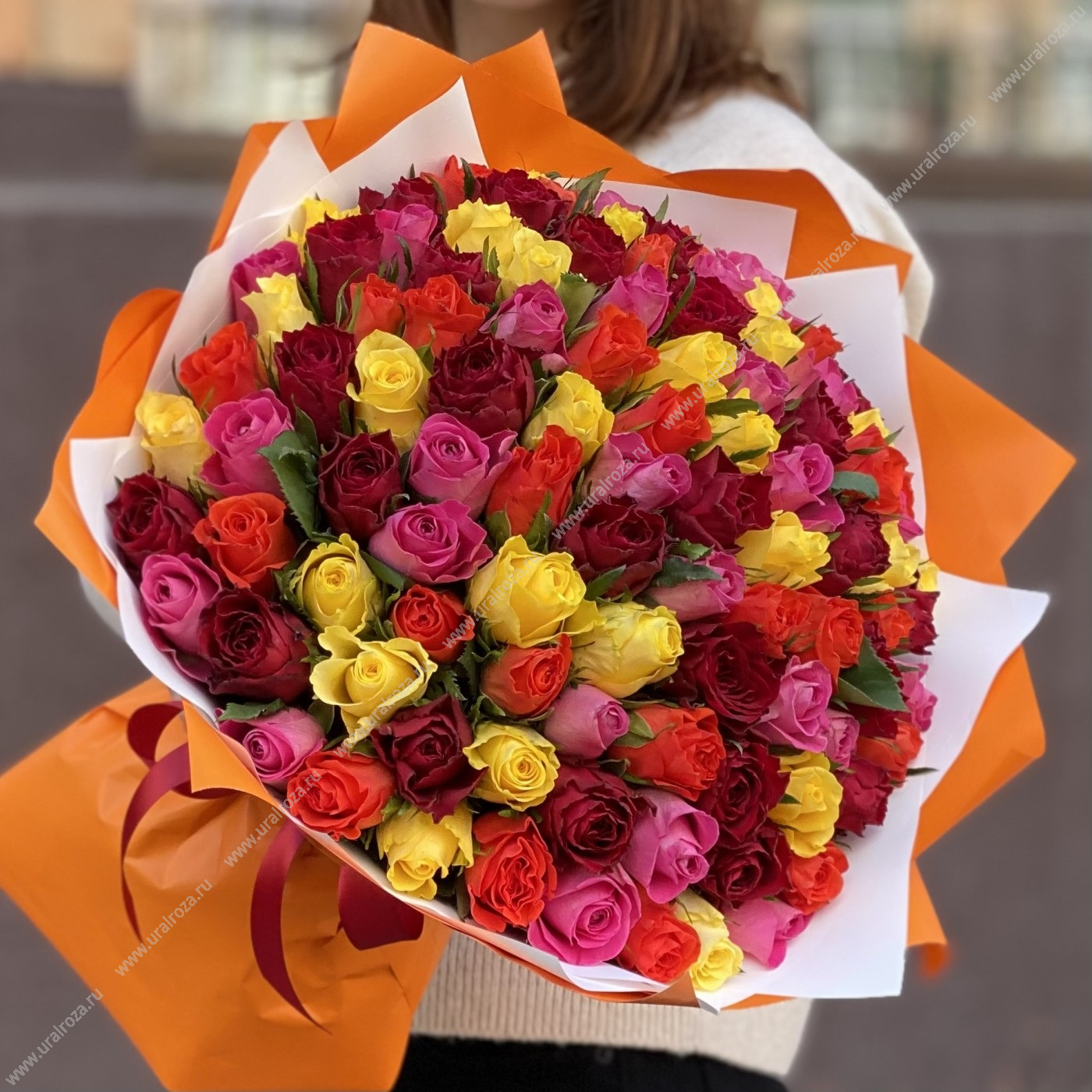 Потрясающий яркий букет из 101 розы никого не оставит равнодушным. Охапка свежих ароматных роз приводит в неподдельный восторг и вызывает самые прекрасные эмоции. Букет из 101 розы выглядит роскошно, это действительно незабываемый подарок, которым хочется любоваться и наслаждаться ароматом свежих роз.