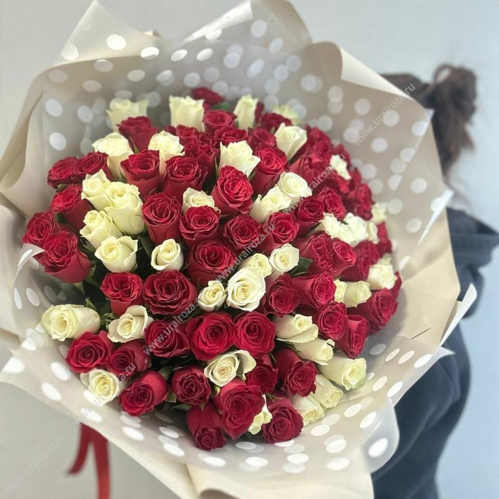 Букет из 101 бордово-белой розы. Кенийские розы отличаются небольшим размером, но способны удивить своей формой бутона, стойкостью и очень привлекательной стоимостью!