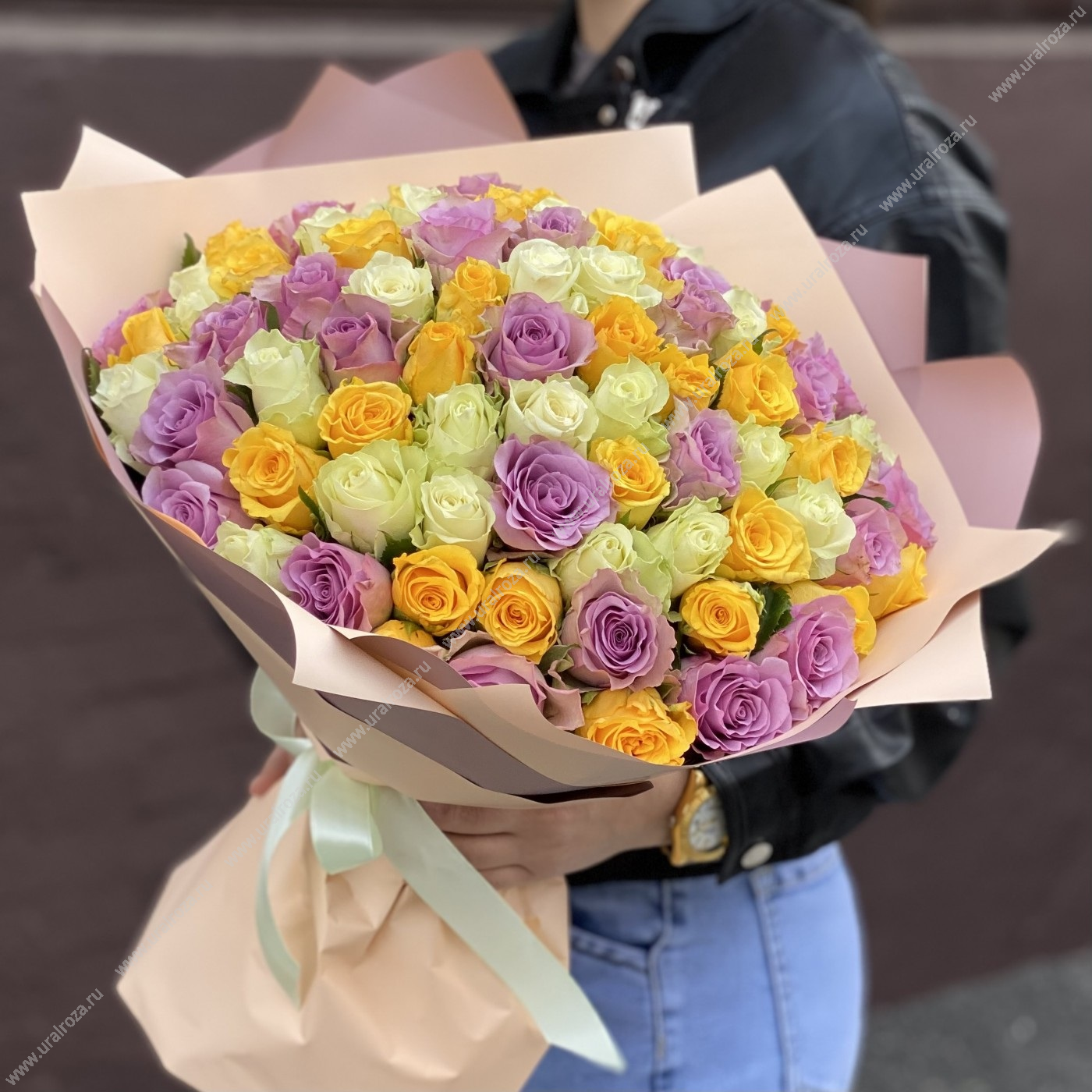 Летний микс состоит из свежих 40-сантиметровых роз нежных оттенков белого, желтого и розового цветов, эффектно перевязанных шелковой лентой. Яркое сочетание и разнообразие тонов поднимет настроение с первых мгновений, а стойкий аромат едва раскрывшихся бутонов покорит сердце и подарит чувство настоящей эйфории.