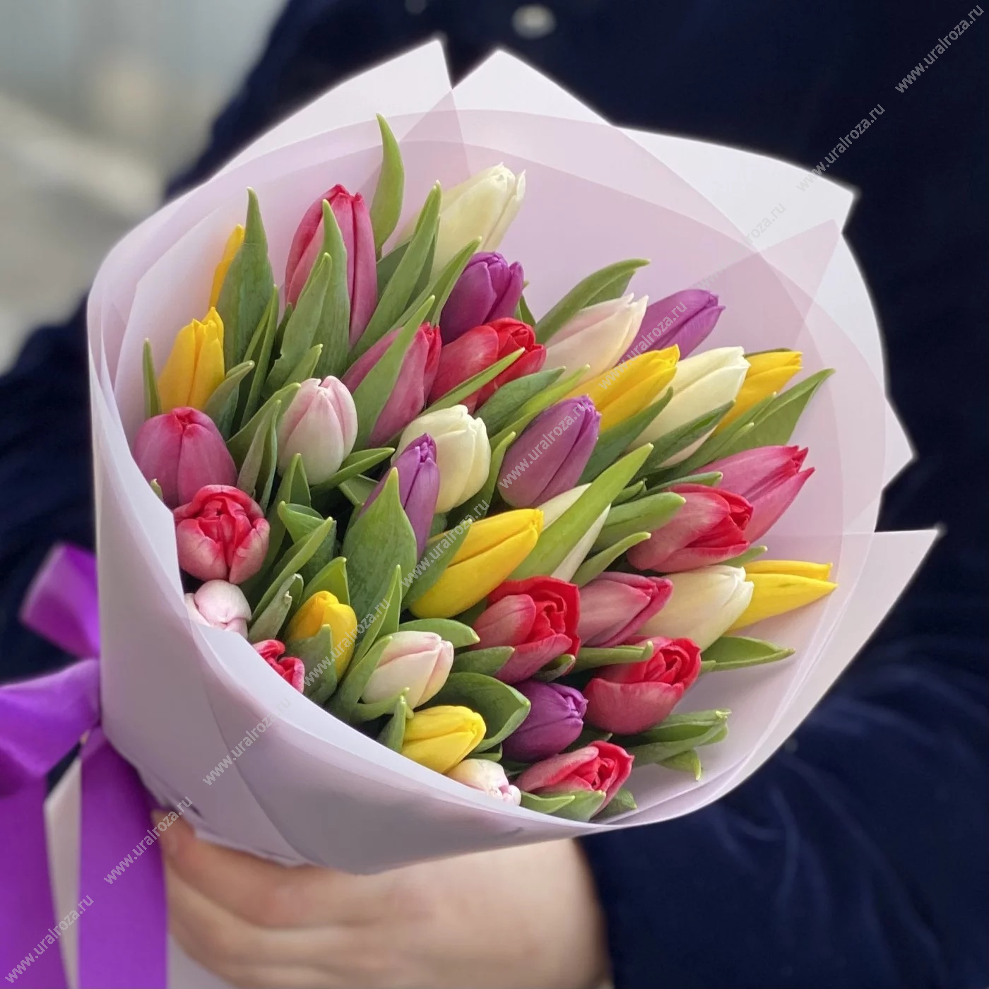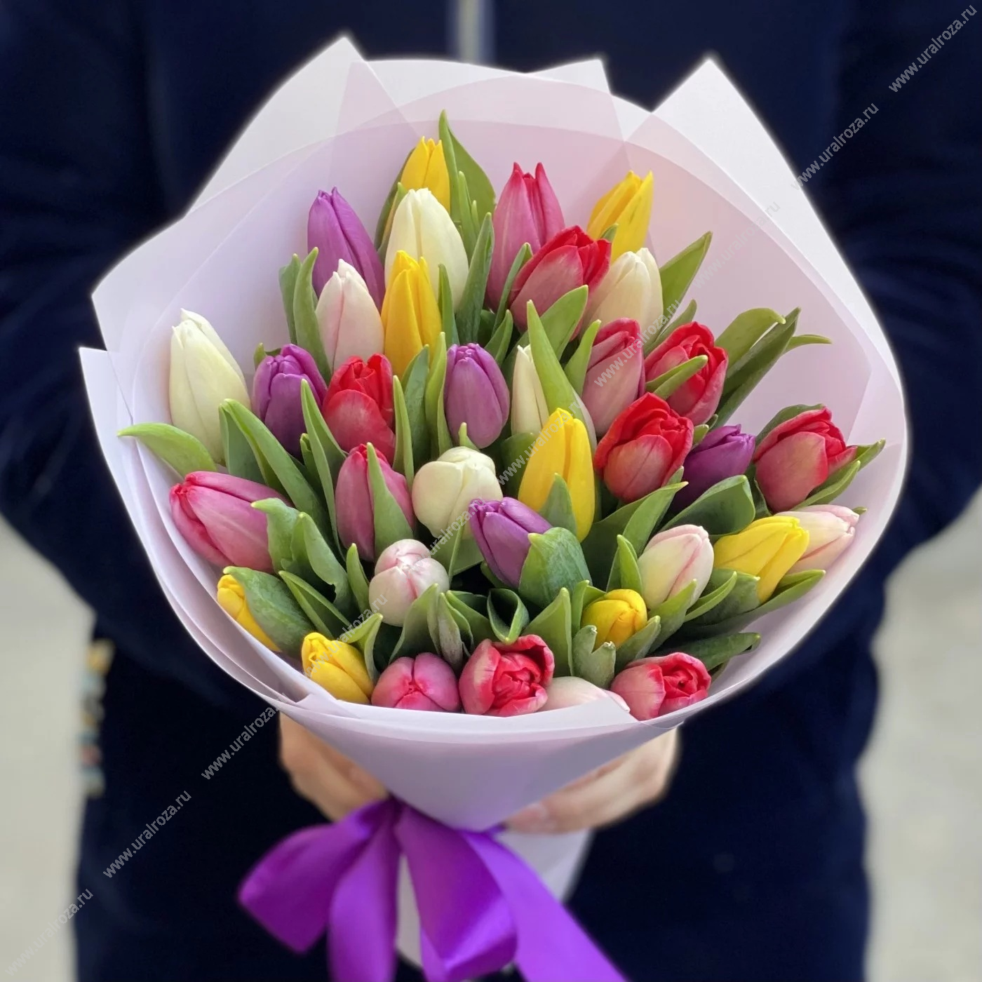- Состав: Тюльпан МИКС (35шт.); Пленка матовая (2шт.); Лента атласная (1шт.);