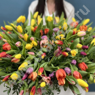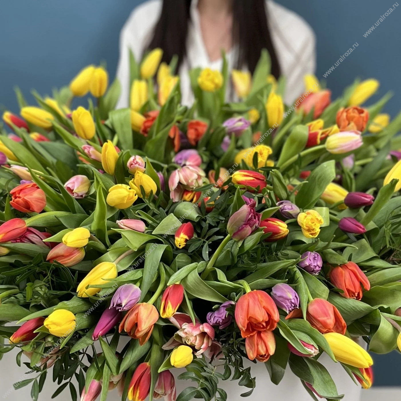 Огромная коробка с разноцветными тюльпанами, настольная композиция, не требует вазы, но требует ежедневного полива.