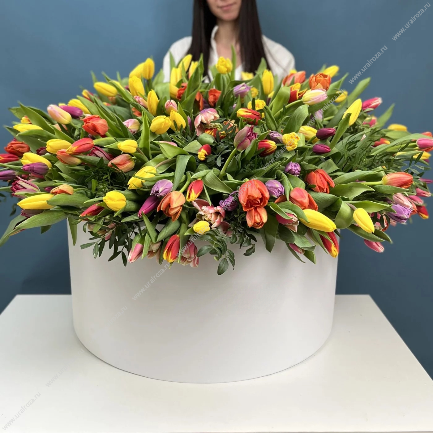 - Состав: Пиафлор кирпич (5шт.); Коробка цилиндр до 200 роз (1шт.); Тюльпан МИКС (301шт.); Лента атласная (1шт.);