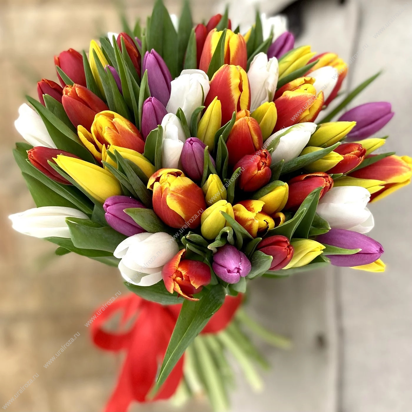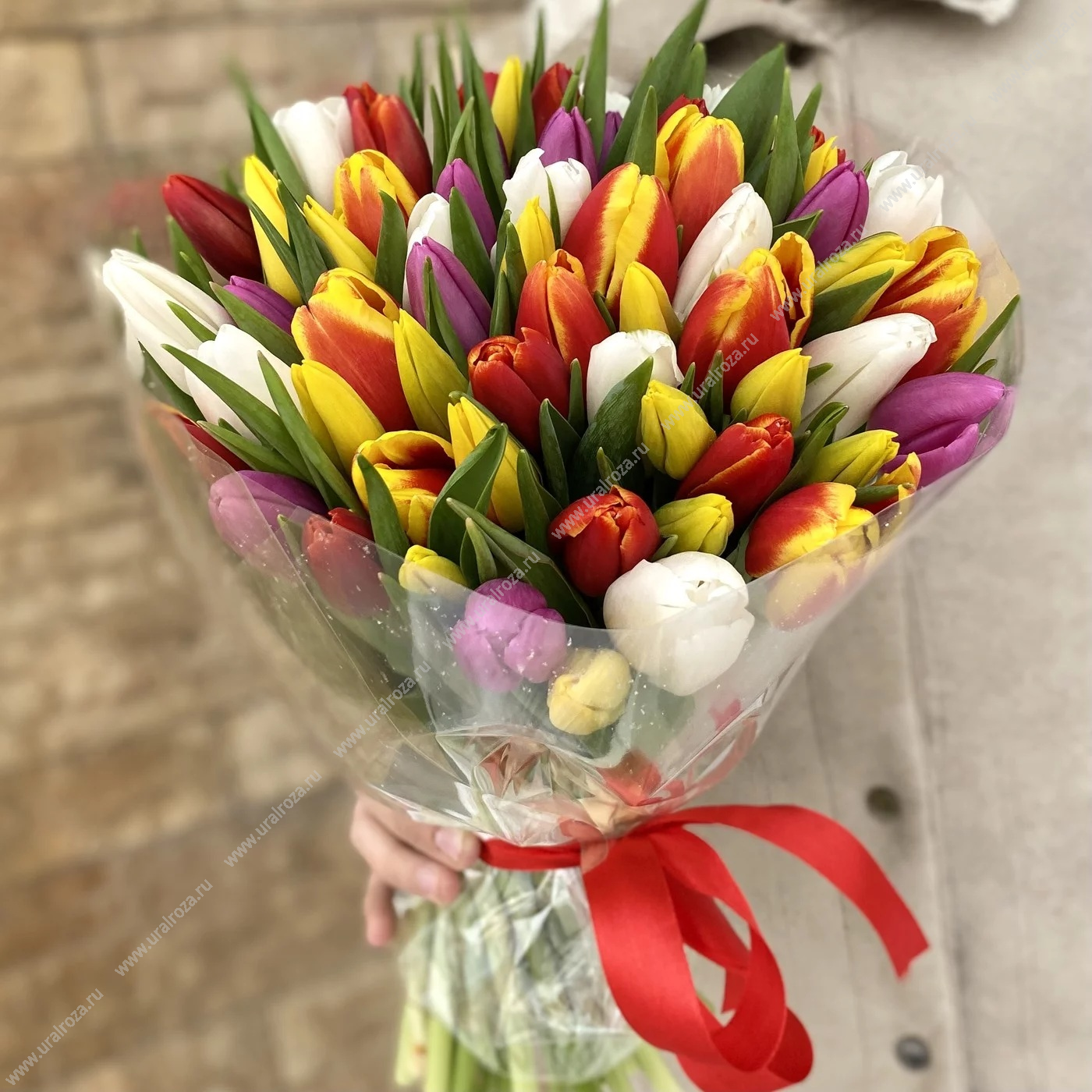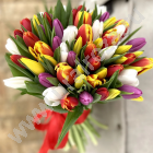 - Состав: Пленка матовая (2шт.); Тюльпан МИКС (45шт.); Лента атласная (1шт.);