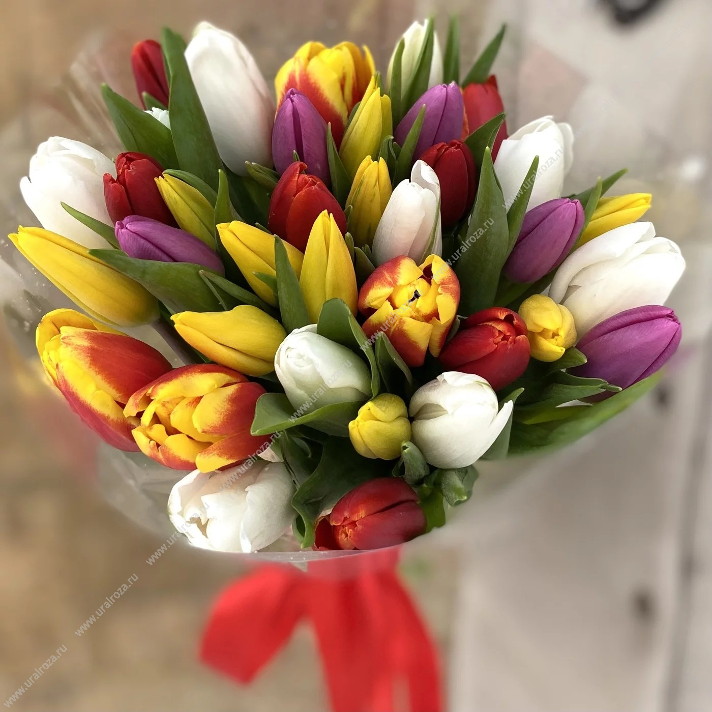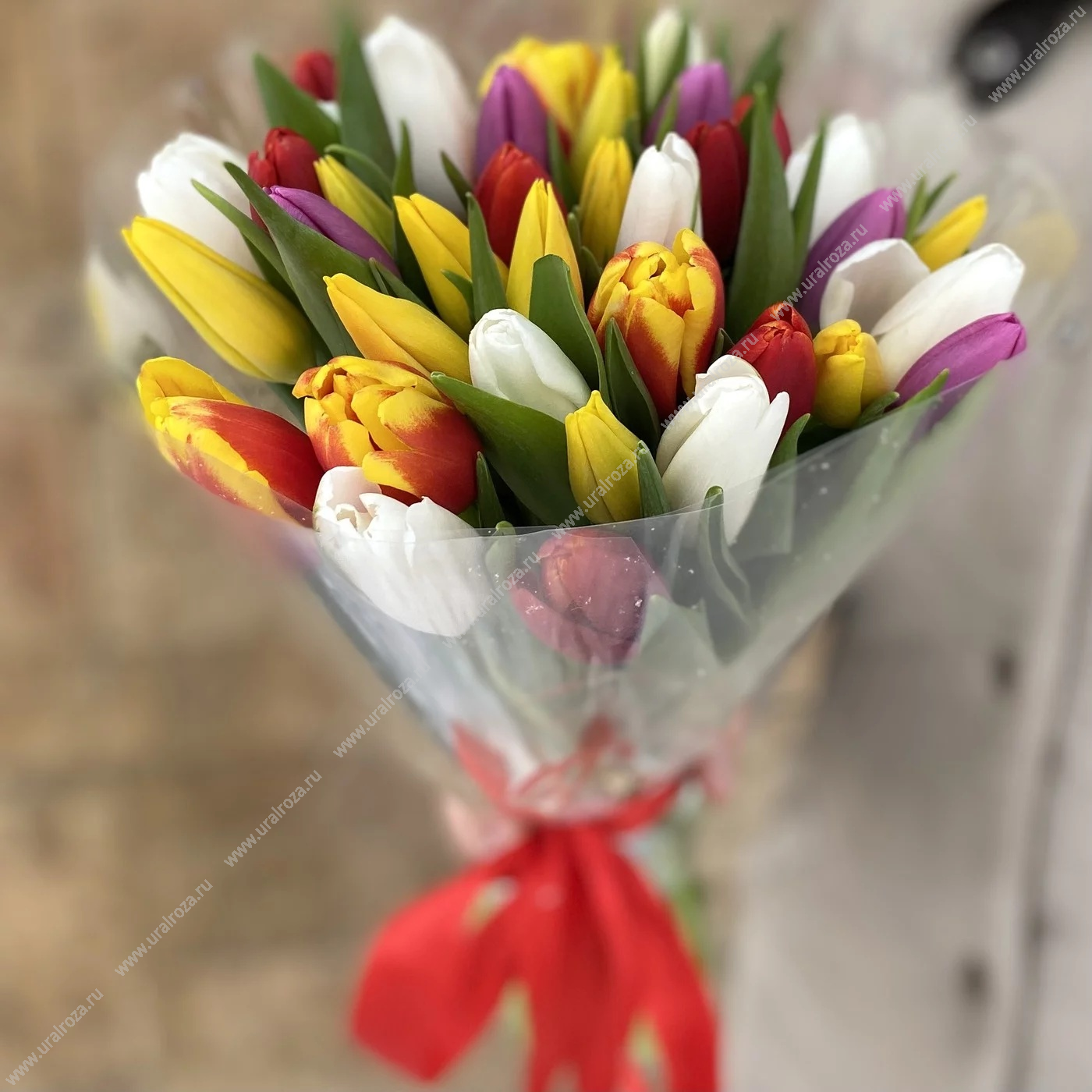 - Состав: Лента атласная (1шт.); Тюльпан МИКС (35шт.); Пленка матовая (2шт.);