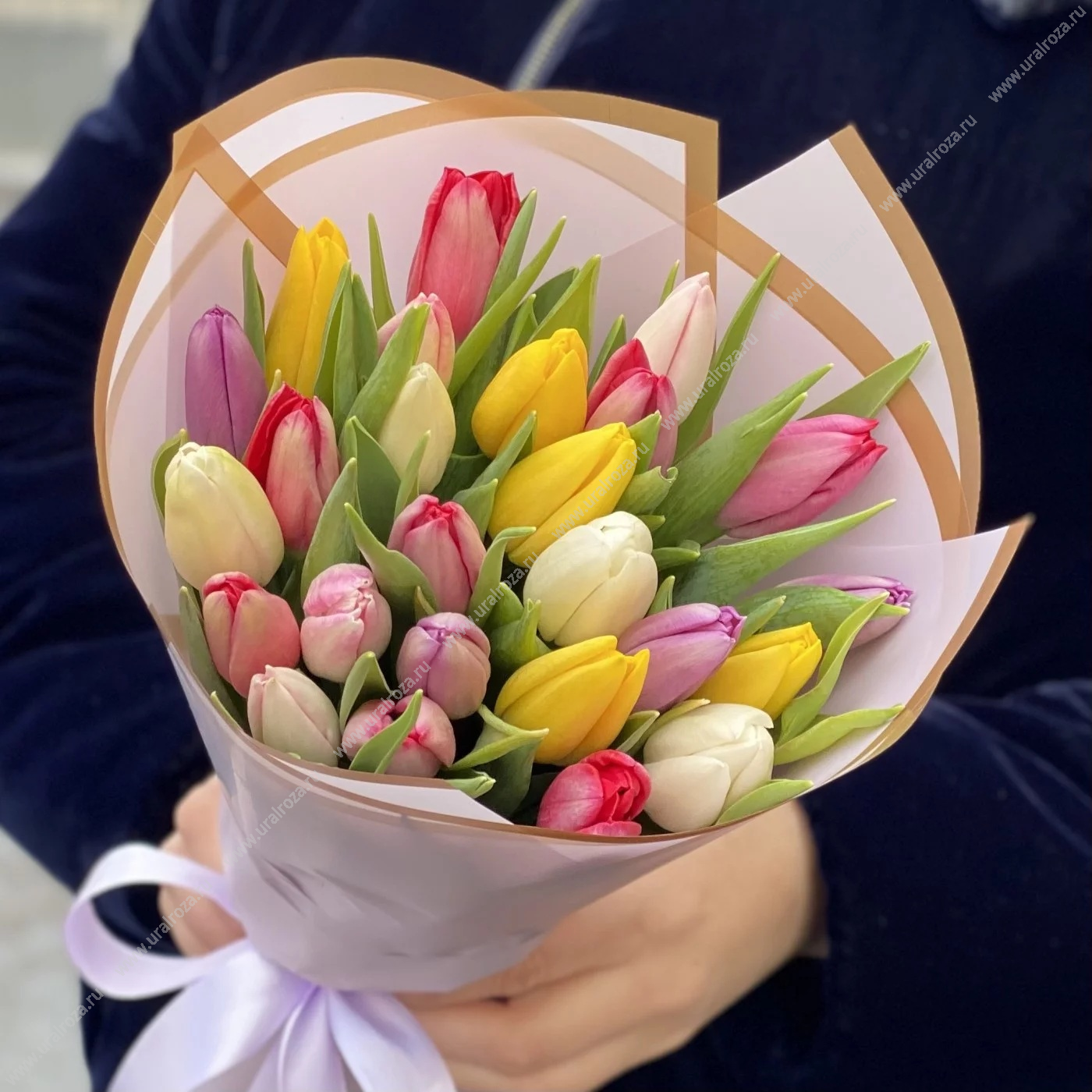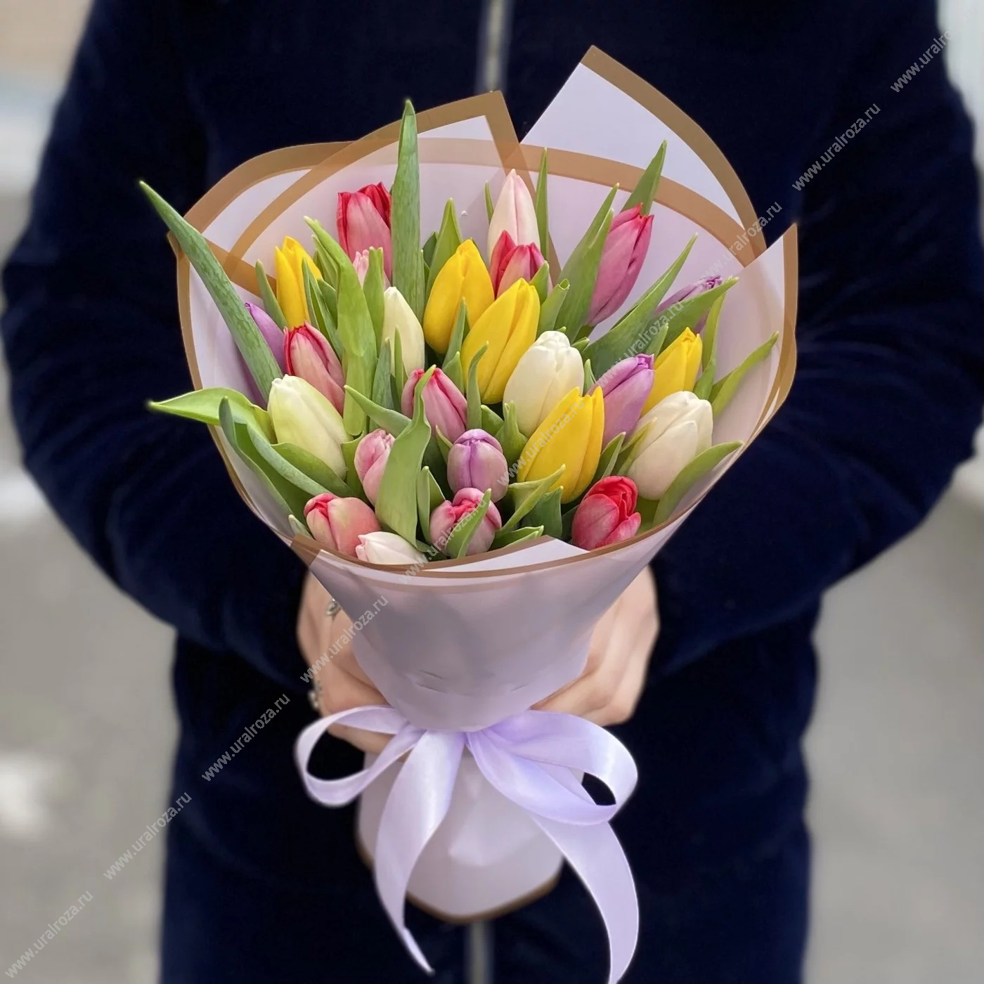 - Состав: Тюльпан МИКС (25шт.); Лента атласная (1шт.); Пленка матовая (1шт.);