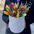 Коробка с разноцветными тюльпанами, настольная композиция, не требует вазы, но требует ежедневного полива.