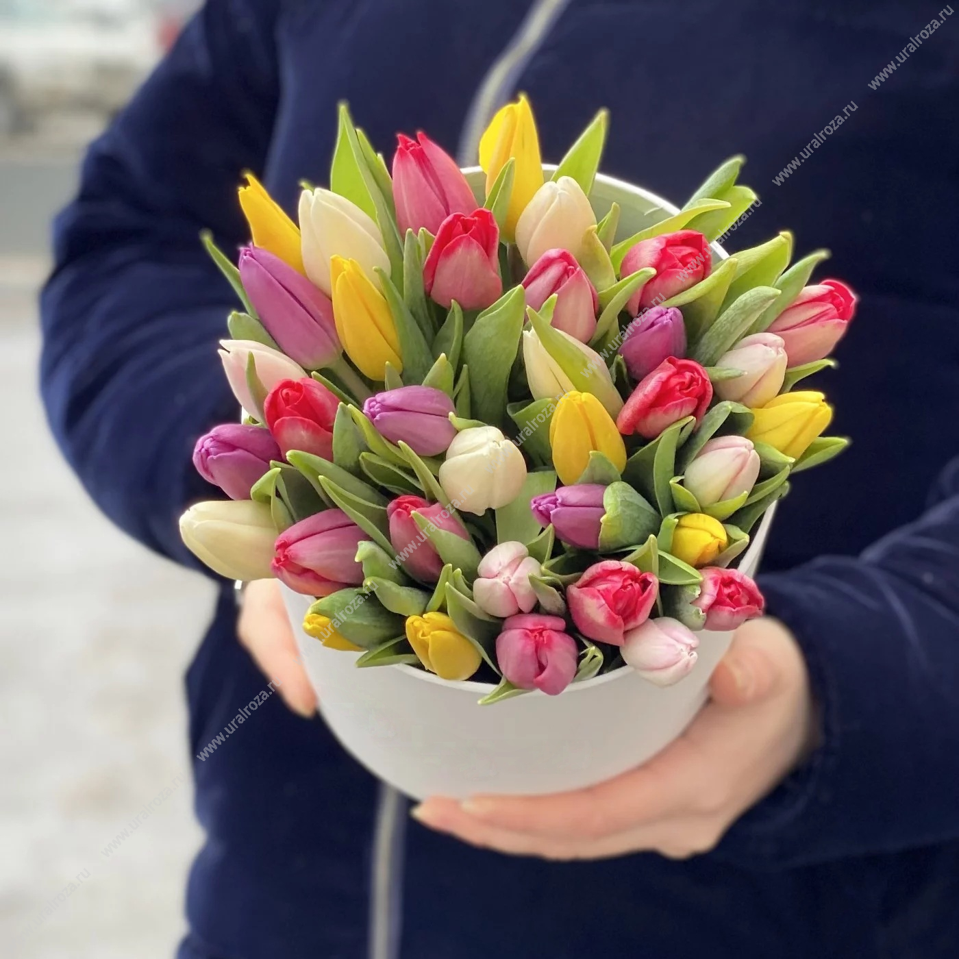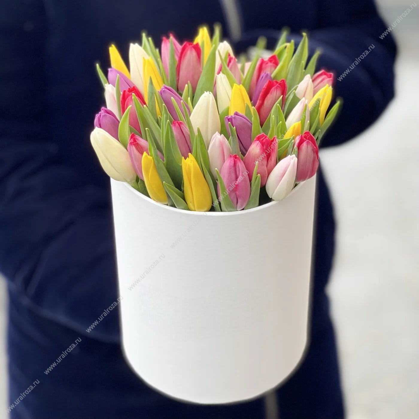 - Состав: Коробка цилиндр до 35 роз (1шт.); Лента атласная (1шт.); Тюльпан МИКС (35шт.); Пиафлор кирпич (1шт.);