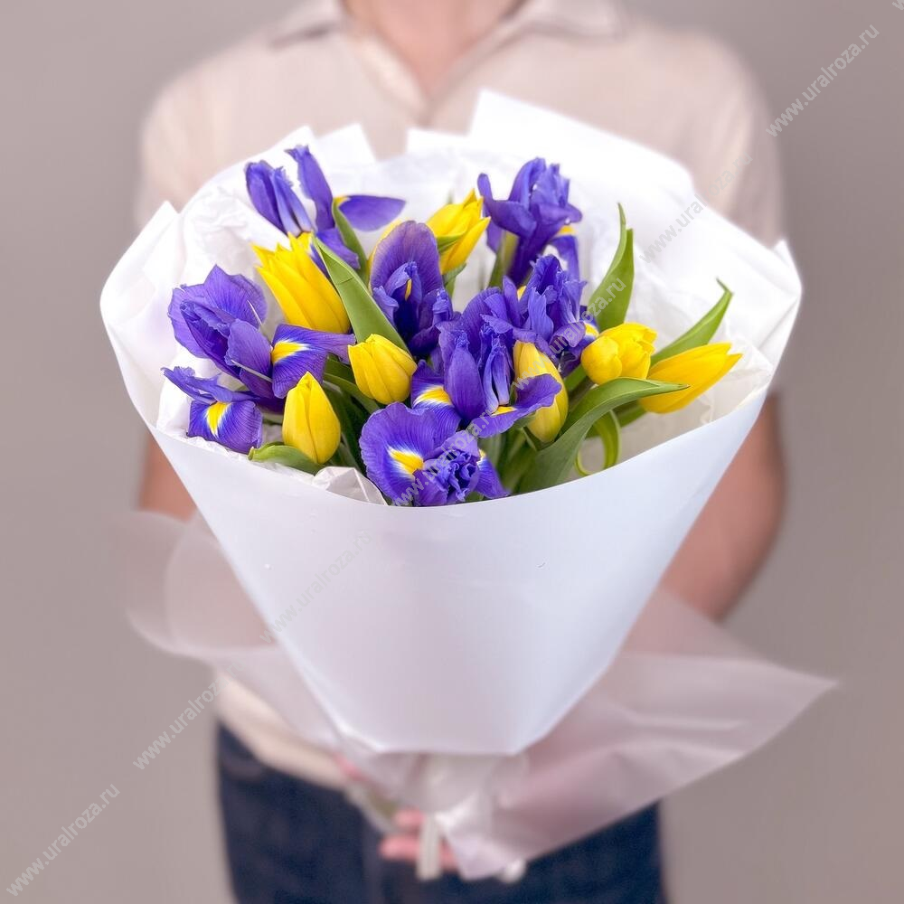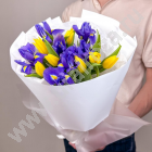 - Состав: Тюльпан желтый (8шт.); Ирисы синие (7шт.); Пленка матовая (1шт.); Лента атласная (1шт.);