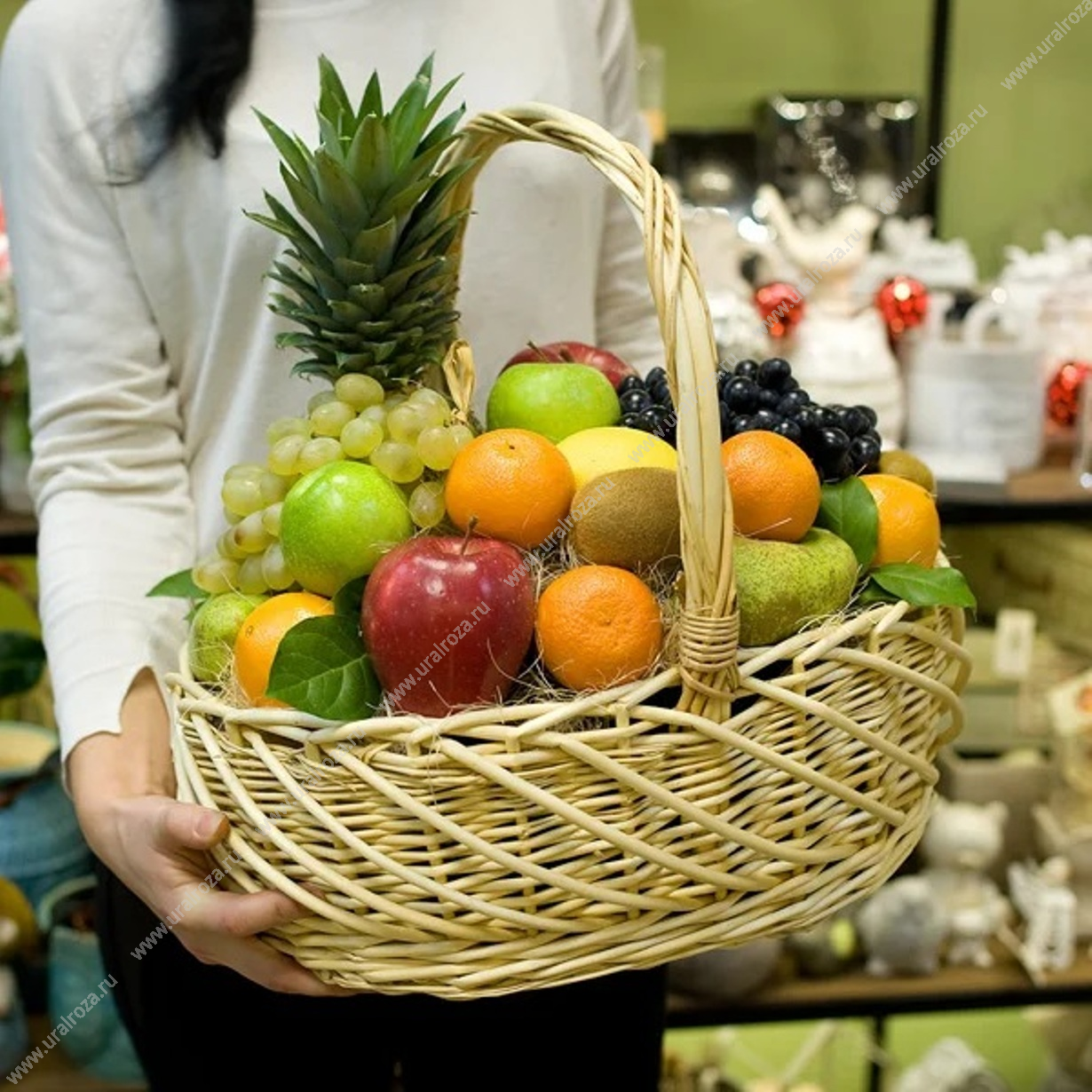 Это корзина, наполненная разнообразными свежими фруктами. Она красиво декорирована, и её можно использовать как для украшения стола, так и в качестве полезного и вкусного подарка. В корзине 7 кг фруктов + ананас или помело (зависит от сезона)